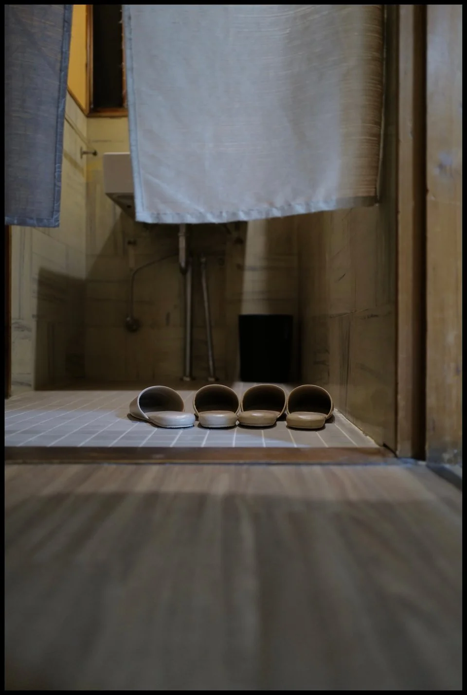 An aside on slippers. Oh my god, slippers! So. Many. Slippers. Well, three different sets to be more accurate. Slippers to take you from lobby to the entry of your room. Slippers to take you from the in-room washbasin to the toilet, a distance of — maybe — 800mm. And slippers — well, wooden sandals really — to take you two metres at most across the courtyard from the guesthouse to the bathhouse.