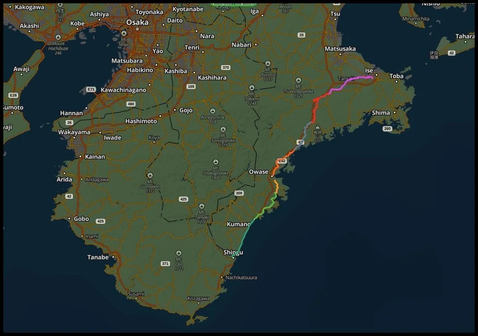 This time, I’ll be travelling one of the old Kumamo Kodo pilgrimage trails in Japan, ambling along a 170km stretch known as the Ise-ji. It’s that little rainbow snake in the image above.