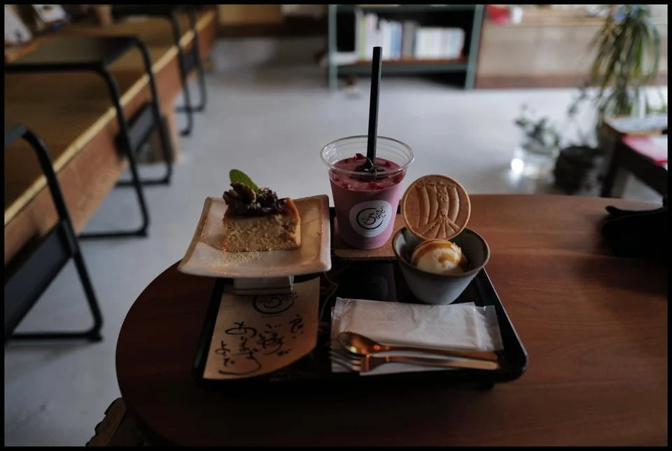 Hungry after the pass and newly-able to add more food to my gastrointestinal tract, we stopped by a cafe not far past the Takihara-no-Miya Shrine which we’d just visited. Run by a couple in their 40s, it was a surprising bubble of cosmopolitan Japanese cafe culture in the otherwise sleepy village of Takihara. Desperate for some fibre any which way I could get it, I ordered smoothie made with strawberries sourced from local farms. And desperate for a little indulgence after so much asceticism, I ordered their homemade cheesecake, too. Delighted doesn’t cover it.