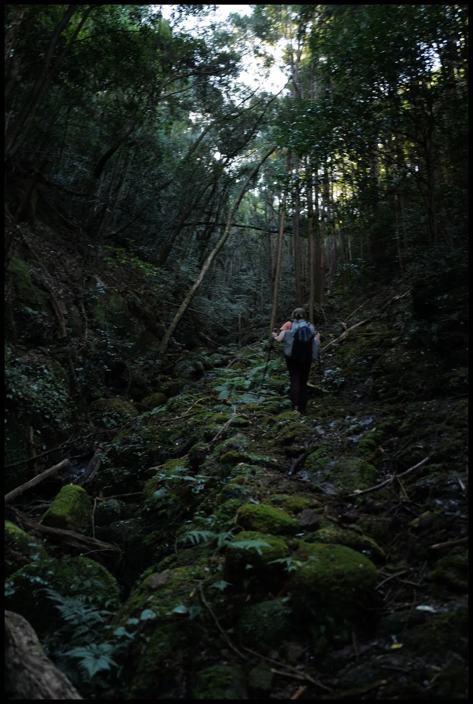 And then the most batshit climb of the entire walk. Following Craig Mod’s maps, just outside the hamlet of Hadasu we headed uphill. What began as an ancient path — a loose, linear assemblage of stones marked as the Kumano Kodo on Gaia GPS — at some point just petered out in to fallen cedar logs and ferns. Kalia and I fairly bashed our way to the top of the hill, grateful to have reached a well-trodden path again but completely unwilling to stop for even a moment. Everything below the waist was starting to ache and I marvelled at the abuse my feet and ankles had sustained, but I was beginning to run very low indeed.